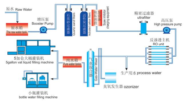 原水(自來水、地表水、地下水)經(jīng)過預(yù)處理系統(tǒng),阻垢劑投加系統(tǒng),精密過濾器,通過高壓泵將原水送至反滲透裝置直接產(chǎn)出產(chǎn)品水稱為單級反滲透。