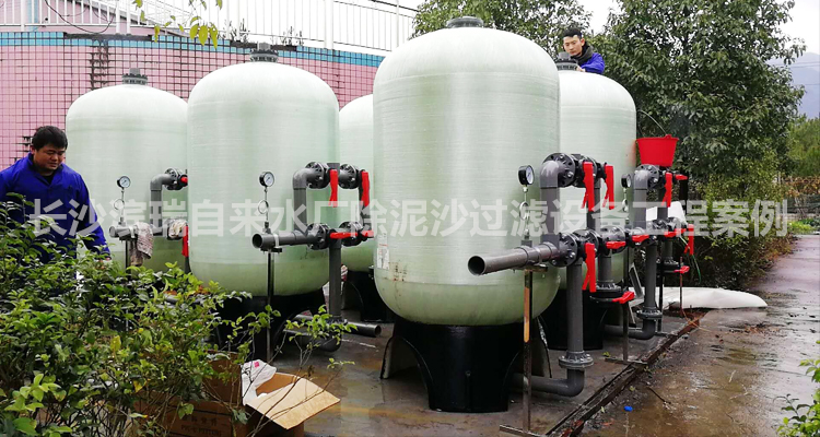 該自來水廠原水從河中抽取,進入蓄水池,進出水管徑DN400,自來水廠用水量大,原水發黃、水中泥沙雜質重,尤其是洪汛時期,必須要有一臺出水量大,效果好的設備對原水進行處理后,方可使用,針對該自來水廠用水需求,長沙濱瑞設計了一套六罐除泥沙設備,以滿足用戶特殊時期的用水需求。該套設備進出水管徑DN80,為三組兩級過濾,三進三出,同時工作,配三臺增壓泵,三組電控,設備內填10噸石英砂,由長沙濱瑞設計制作,根據客戶需求現場安裝調試。