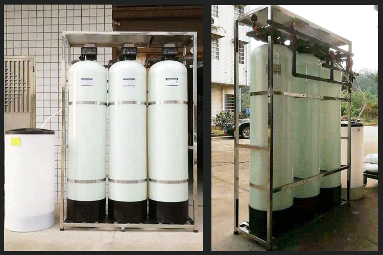 該套設備為一體化設備,4噸自動除泥沙過濾器加4噸雙罐雙閥全自動軟水器一起固定于不銹鋼座架上,材質為玻璃鋼,設備出廠前由工程師接好管路,調好程序,客戶拿到貨以后接好進出水管及排污管即可。