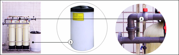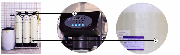 設備組成:微電腦主機控制器、玻璃鋼樹脂罐、加藥鹽箱、連接管件、軟水鹽、陽離子樹脂。