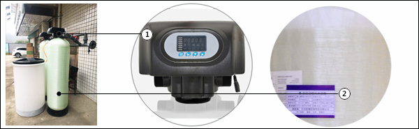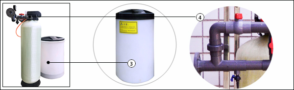 設備組成:自動控制閥、玻璃鋼樹脂罐、加藥鹽箱、鏈接管件、軟水鹽、陽離子樹脂。
