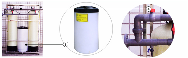 設備組成:自動控制閥、玻璃鋼樹脂罐、加藥鹽箱、連接管件、軟水鹽、陽離子樹脂